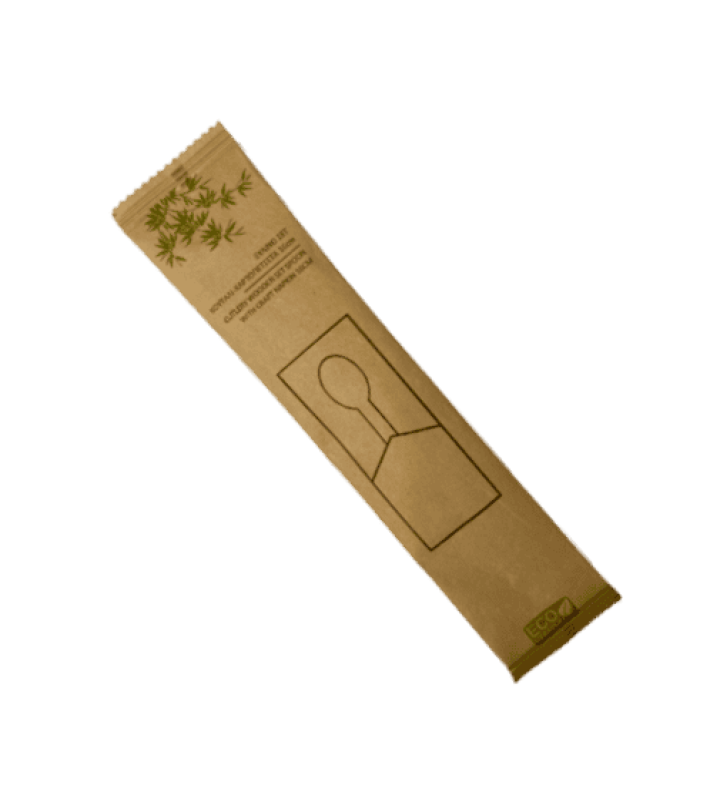 Κουβέρ ξύλινο με κουτάλι 16cm και craft χαρτοπετσέτα συσκευασμένο 1/1 σε χάρτινο craft περιτύλιγμα 50τεμάχια*20πακέτα